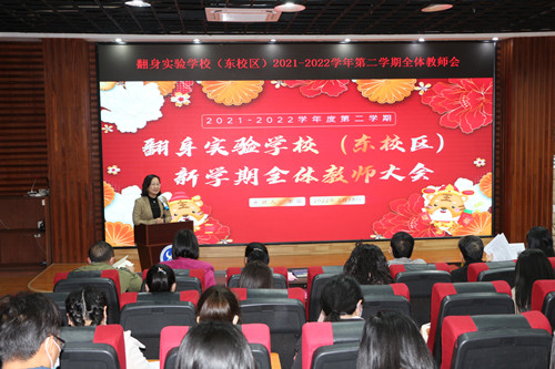 2月18日上午,李晶校長主持召開翻身實驗學校(東校區(qū))新學期全體教師會,借林良浩董事長《虎年言志》一詩,梳理新學期工作關鍵詞,圍繞師德師風、黨建思政教育、中高考備考、小班教學實踐等十大方面解讀新學期的重點工作,并就開學初主要工作進行強調,激勵全體老師添虎勁,揚虎威,創(chuàng)佳績,爭做有力量、有份量、有能量的崛起人。