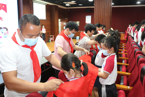 紅領巾是少先隊員的標志,是光榮的象征。校領導、大隊委干部和少先隊代表為新隊員們佩戴了紅領巾,激勵他們將紅色夢想一脈相承。
