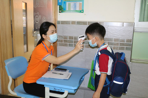 “Good morning, teacher.”久違的問候聲,喚醒清晨的校園。4月13日早上,翻身實(shí)驗(yàn)學(xué)校(東校區(qū))小學(xué)部學(xué)生有序返回校園。校領(lǐng)導(dǎo)、值日行政和老師、家長義工,五步一崗十步一哨,嚴(yán)把入校關(guān)口,引導(dǎo)學(xué)生保持距離、測(cè)溫、洗手消毒,有條不紊錯(cuò)峰入校。